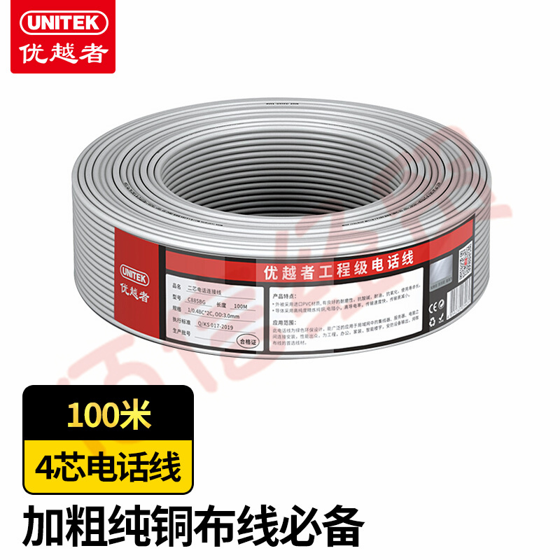 優(yōu)越者(UNITEK)電話線 4芯單股無(wú)氧銅線芯 0.4mm座機(jī)/傳真機(jī)電話延長(zhǎng)線連接線100米C884BG 自營(yíng)