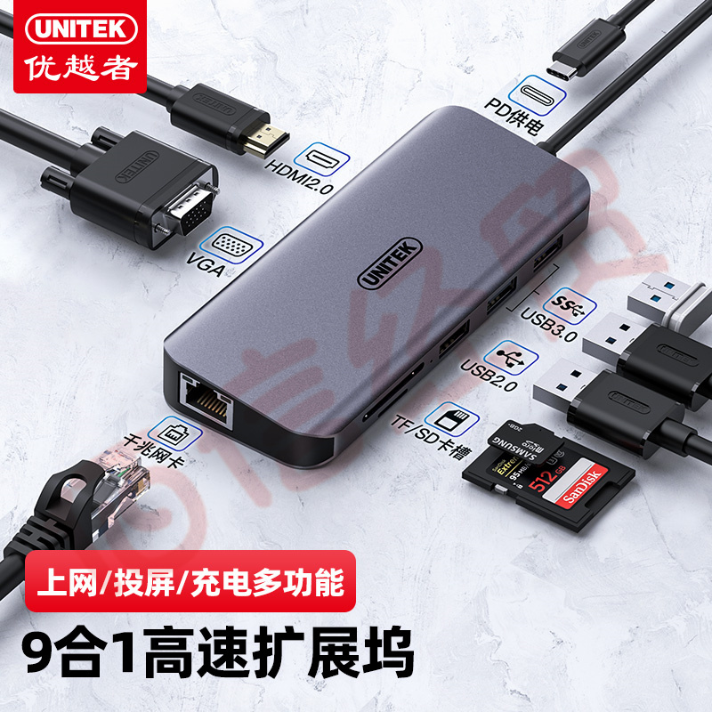 優(yōu)越者(UNITEK)Type-C擴(kuò)展塢 USB-C轉(zhuǎn)HDMI轉(zhuǎn)換器4K投屏VGA拓展塢轉(zhuǎn)接頭網(wǎng)口分線器 D026B 自營(yíng)