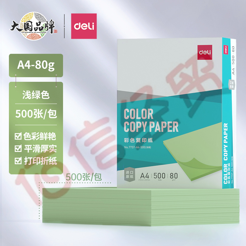 得力(deli)A4 80g 淺綠色彩紙復印紙 彩色非厚卡紙兒童手工紙剪紙打印紙 500張/包 7757-A4-500 自營