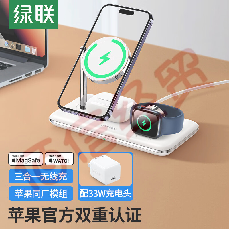 綠聯(lián) MFi認證 蘋果三合一無線充電器15W蘋果Magsafe磁吸支架快充適用iPhone14/13/12/Apple Watch8/7手表耳機 自營