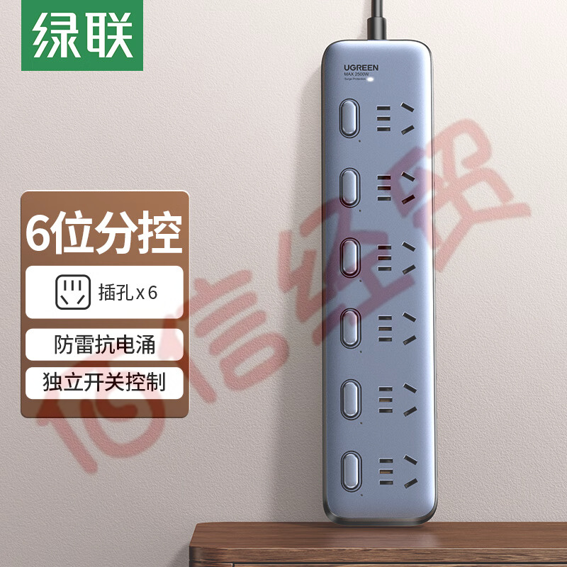 綠聯(lián) 新國標(biāo)6位分控防雷插座 抗電涌防電涌插線板/插排/排插/插板/接線板/拖線板 獨(dú)立開關(guān)全長2米 90861 自營