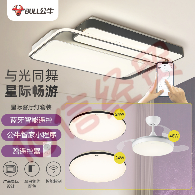 公牛(BULL)LED吸頂燈X36星際MX-M130B-CD無線遙控/小程序智能控制/無極調(diào)光 :客廳燈+燦軒臥室燈*2+吊扇 自營
