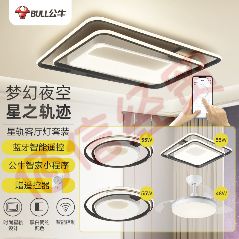 公牛(BULL)LED吸頂燈X35星軌系列MX-M130A-CD小程序控制無極調(diào)光三檔調(diào)色 客廳燈+方形燈+圓形燈*2+風(fēng)扇 自營(yíng)