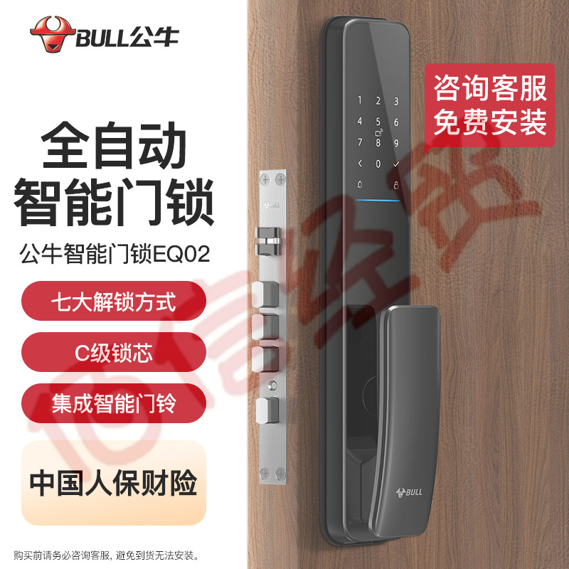 公牛(BULL) 智能門鎖 家用防盜門電子鎖 指紋鎖密碼鎖APP/wifi帶門鈴 C級鎖芯 全自動電子鎖 EQ02王力鎖體 自營