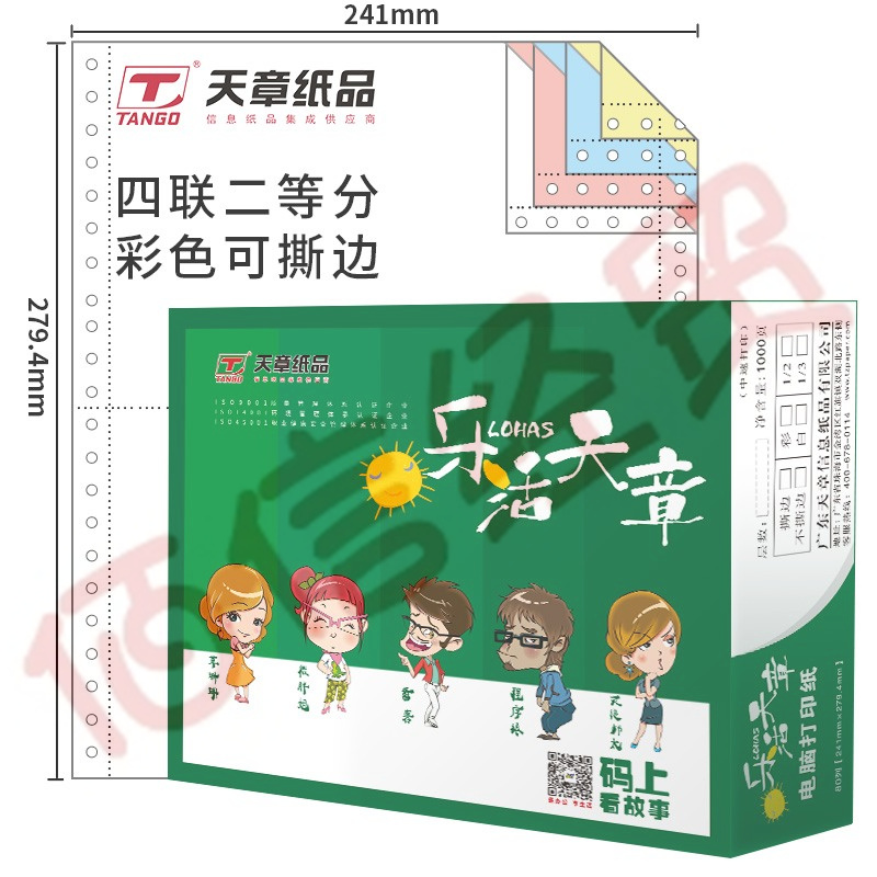¥64.90天章(TANGO)樂活天章 針式打印紙 四聯(lián)二等分撕邊電腦打印紙 彩色四聯(lián)打印紙241-4-1/2S 白紅藍(lán)黃 1000頁(yè)/箱