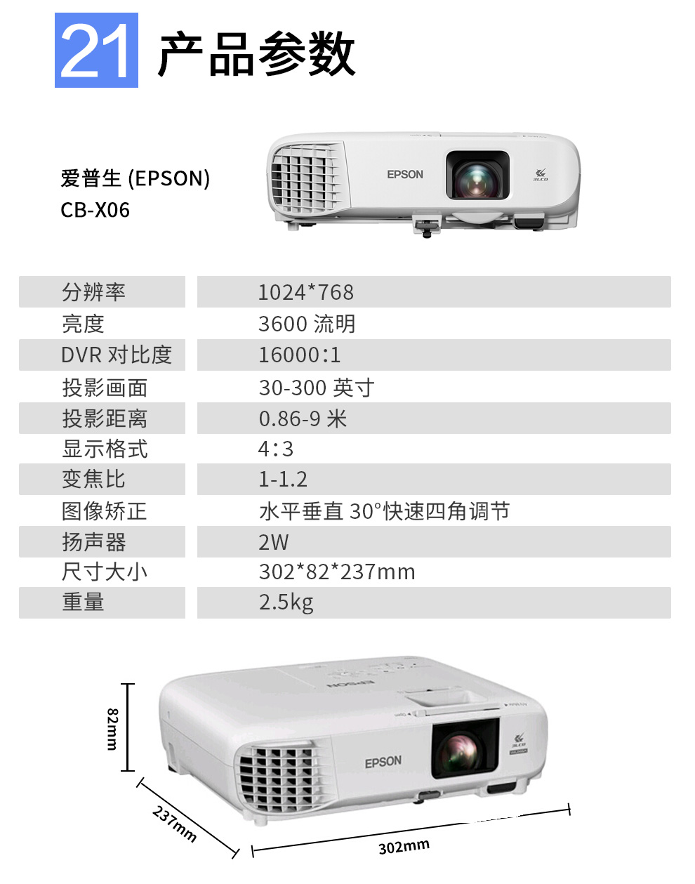 愛(ài)普生(EPSON) CB-X06 投影儀辦公會(huì)議培訓(xùn)商務(wù)投影機(jī)教育教學(xué)便攜投影儀 3600流明 白色