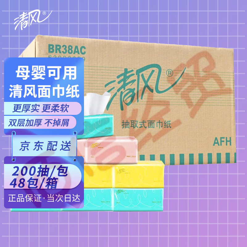 清風 經(jīng)典抽紙三色糖果色原木小規(guī)格2層200抽家庭面巾餐巾衛(wèi)生手紙巾48包整箱BR38AC1