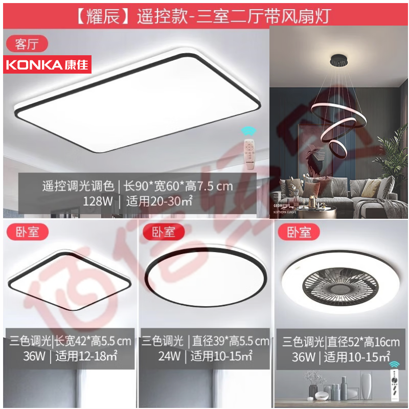康佳(KONKA)客廳燈LED吸頂燈客廳臥室書房餐廳燈超薄燈飾北歐現(xiàn)代燈具 耀晨 【耀辰】三室二廳(帶風(fēng)扇) 自營