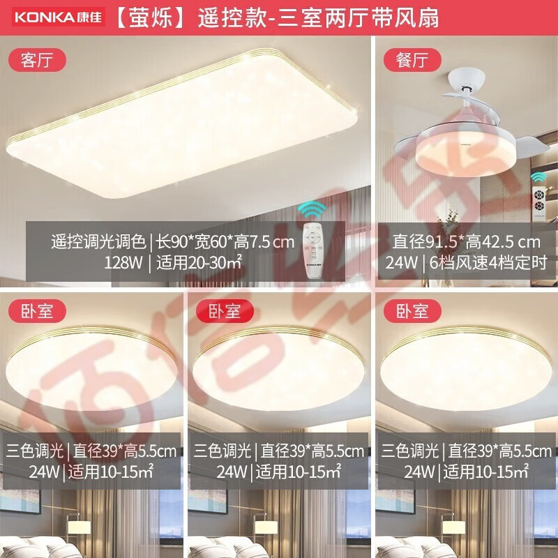康佳(KONKA)客廳燈臥室護(hù)眼吸頂燈書(shū)房?jī)和糠浪{(lán)光防頻閃led 3室2廳/帶風(fēng)扇 自營(yíng)