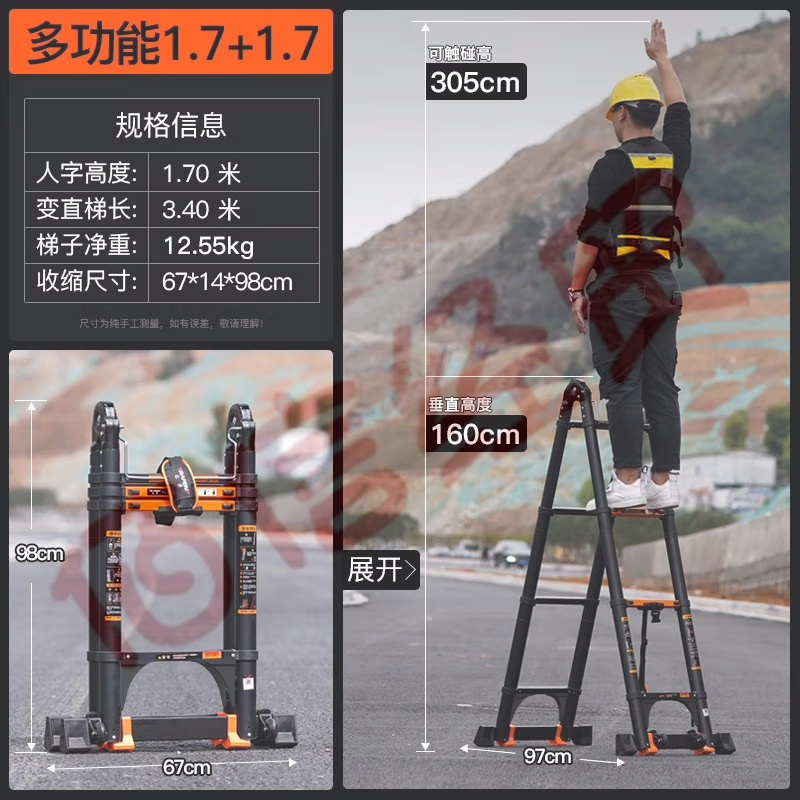 巴芬伸縮梯多功能梯子家用梯人字梯加厚鋁合金工程梯升降直梯折疊樓梯 多功能1.7米【拱橋防晃+防滑】 自營
