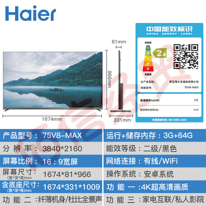 海爾(Haier)海爾電視120Hz高刷3+64GB超大內(nèi)存4K超高清全面屏8K解碼游戲電視全通道教育液晶平板電視機75英寸75V8-MAX