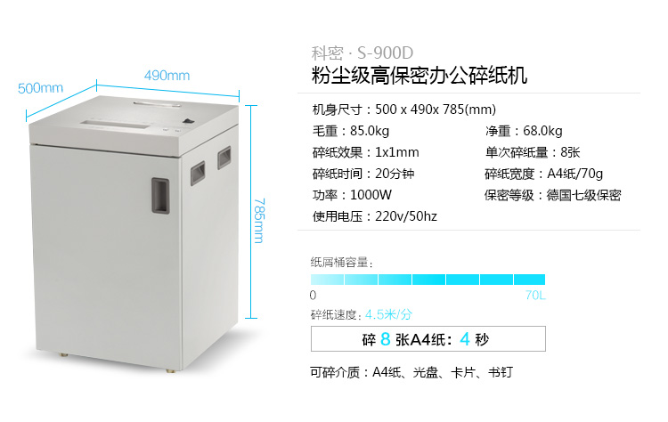 科密 (comet) S-900D 多功能大型長(zhǎng)時(shí)間德國(guó)7級(jí)高速辦公碎紙機(jī) 光盤(pán)粉碎機(jī) 自營(yíng)